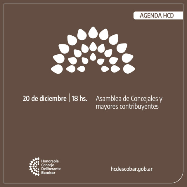 Por último, se designará a un Concejal y a un Mayor Contribuyente para la firma del Acta de la Asamblea, que se llevará a cabo en las instalaciones del Honorable Concejo Deliberante de Escobar, que se encuentra en avenida Eugenia Tapia de Cruz 1280, Belén de Escobar, el viernes 20, a las 18 horas.