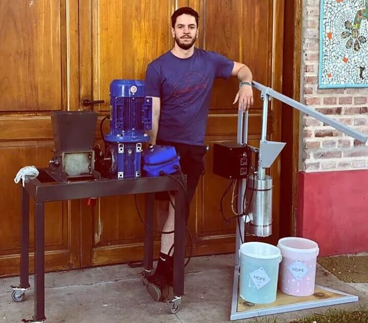 Fue así que Vázquez empezó a usar el tiempo libre que le dejaba su trabajo en la empresa de siderurgia para dar sus primeros pasos en reciclado. “Un ecologista holandés puso planos de una trituradora y una inyectora de plástico en la web. Los bajé y armé mis primeras máquinas para empezar a hacer pruebas”, relata Martín sobre sus primeros pasos como emprendedor.