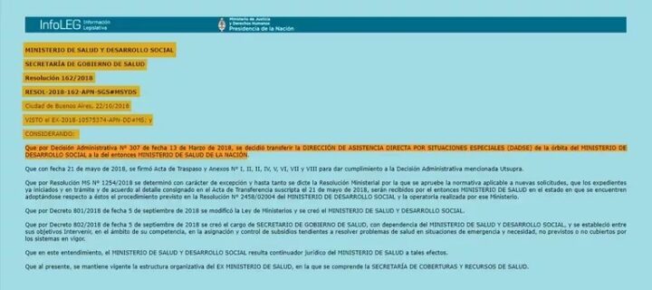 Según se pudo reconstruir a través de documentación oficial, el gobierno de Macri “por decisión administrativa número 307 de fecha 13 de marzo de 2018, decidió transferir la Dirección de Asistencia Directa por Situaciones Especiales (DADSE) de la órbita del Ministerio de Desarrollo Social a la del entonces ministerio de Salud de la Nación”.