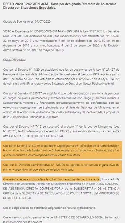 Según el Boletín Oficial, a través de la Decisión Administrativa 1242 del 7 de julio 2020, se designó “a partir del 5 de mayo de 2020 y por el término de 180 días hábiles a la señora Claudia Noemí Mori en el cargo de Directora de Asistencia Directa por Situaciones Especiales de la Dirección Nacional de Asistencia Directa Compensatoria de la Subsecretaría de Asistencia Crítica de la Secretaría de Articulación de Política Social del Ministerio de Desarrollo Social”.