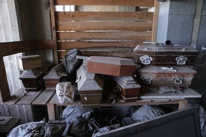 Por último, en el cuarto depósito, llamado “galpón de arena”, se detectaron cuatro lugares separados con 107 ataúdes indiscriminadamente arrumbados junto a más bolsas con restos humanos.