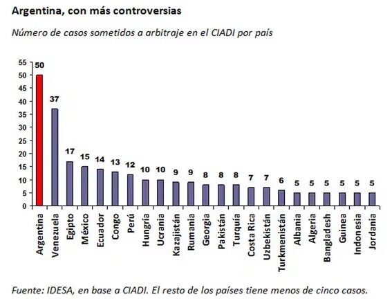 Con sus casos, entre concluidos y pendientes, la Argentina ha sido el país más demandado en el Ciadi, seguido de cerca por Venezuela, con 49. Les sigue un grupo de países entre los que se encuentran España, Egipto, Perú y México, y otro, más rezagado y apretado integrado por Hungría, Ecuador, Kazakstán y Croacia.