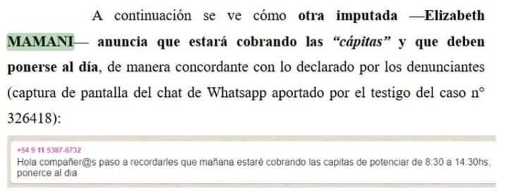 Mamani cumplía tareas en el comedor “Rivadavia 1″ y tenía una misión asignada: cobrar las cápitas. Así lo muestra una de las capturas de mensajes expuestas en el dictamen del fiscal Gerardo Pollicita: “Hola compañeros, paso a recordarles que mañana estaré cobrando las capitas del Potenciar de 08.30 a 14.30hs. Ponerse al día”. En otras palabras, su función era cobrar una suma de dinero que se usaba para “sostener” al comedor. Lo cierto es que el destino final de esa plata es, por ahora, un misterio.