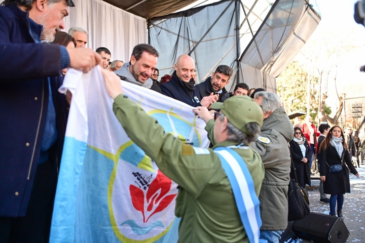 Cerca del mediodía comenzó el desfile que contó con la participación de estudiantes, entidades sociales y clubes de barrio, servidores públicos y veteranos de guerra escobarenses. Estos últimos le obsequiaron al intendente una bandera de Escobar que flameó en las Malvinas, gracias al programa municipal “No las hemos de olvidar” que financia el viaje a las islas para excombatientes del distrito.