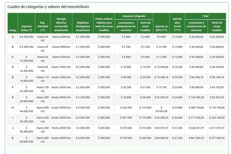 Por otra parte, en julio aumentó el impuesto integrado mensual y se suma la modalidad servicios para las tres categorías más altas, que antes solo incluían a los vendedores de objetos muebles. Así, el pago del monotributo queda de la siguiente manera: