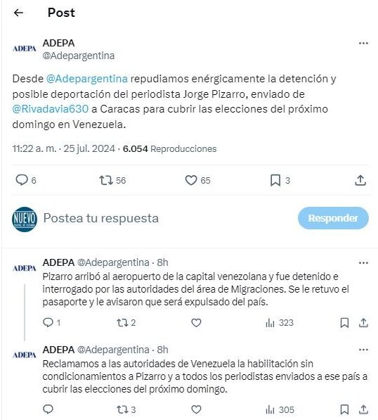 La Asociación de Entidades Periodísticas Argentinas (ADEPA) repudió «la detención y posible deportación» de Pizarro y reclamó a las autoridades de Venezuela que habilite «sin condicionamientos» a Pizarro y a todos los periodistas enviados a ese país a cubrir las elecciones del domingo.