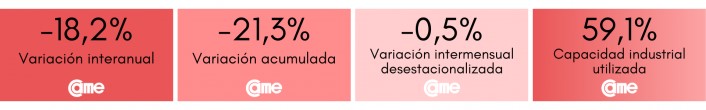 El sector tuvo una contracción anual de 18,2% en julio a precios constantes y de 0,5% en la comparación mensual desestacionalizada. En estos siete meses del año acumula una caída de 21,3% frente a los mismos meses de 2023. Las industrias operaron al 59,1% de su capacidad instalada y el 14,6% de los encuestados tuvo problemas para pagar salarios.