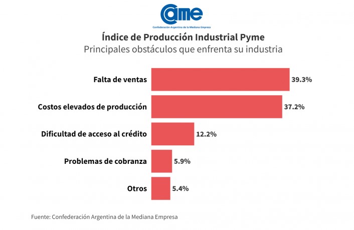 Las empresas manifiestan estar produciendo en un entorno donde la demanda insuficiente, los altos costos y las dificultades financieras se combinan para crear un escenario complicado. Los principales obstáculos que enfrentan en estos momentos tuvieron como protagonista, con el 39,3%, a la falta de ventas, mientras que el 37,2% se refirió a los altos costos de producción y logísticos, el 12,2% a la falta de acceso al financiamiento y otro 5,9% a los problemas de cobranza.