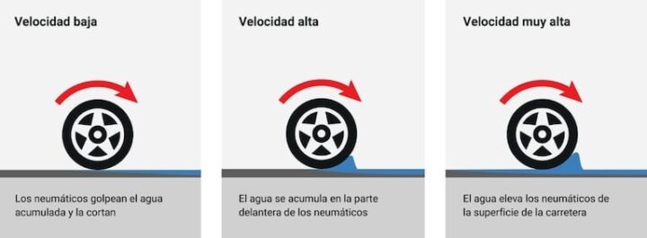 Lo que sucede es que los canales que forman los dibujos de las cubiertas no son capaces de evacuar toda el agua que hay en el pavimento. Entonces se produce un efecto de deslizamiento (la presión del agua empuja por debajo a las cubiertas) ya que el auto parece que “flota”, las ruedas pierden todo el agarre y, como consecuencia, el conductor pierde el control del auto.