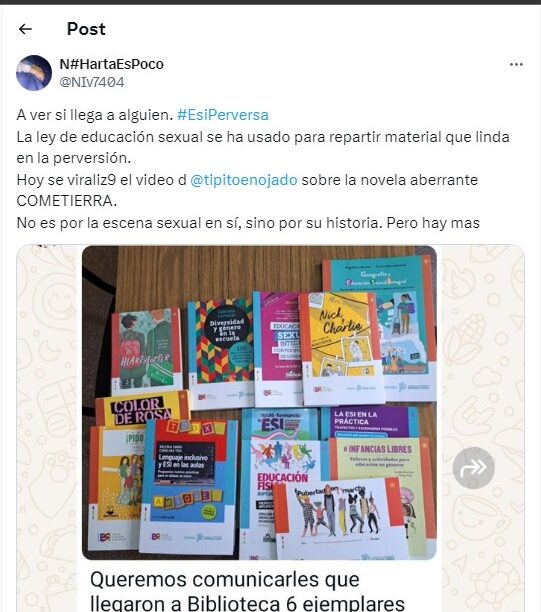 Los títulos que están en el ojo de la tormenta son: “Infancias libres”, que habla de la educación en términos de género; “Trans-formando la ESI”, que va por una línea similar al anterior; “Nick y Charlie”, una historia de amor un tanto polémica y con detalles que podrían no ser aptos para menores; y “NOS”, un juego de cartas que tiene ilustraciones de menores junto a adultos.