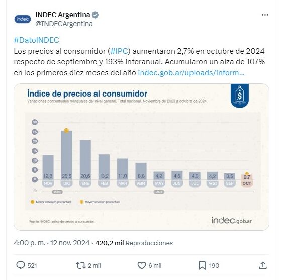 El INDEC difundió el porcentaje de inflación correspondiente al mes de octubre. En lo que va del año acumula un alza del 107% y en la comparación interanual alcanzó el 193%.