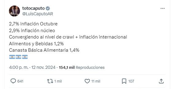 El Ministerio de Economía destacó que “la inflación núcleo fue la menor desde septiembre de 2020, en tanto la general fue la más baja desde noviembre de 2021”. Asimismo, esta última fue un tercio de la inflación registrada en octubre 2023 (8,3%), y la más baja para un mes de octubre desde 2017.