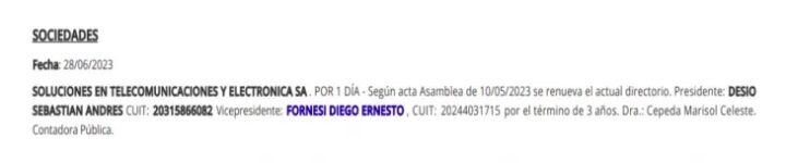 La empresa Soluciones en Telecomunicaciones y Electrónica SA, es presidida por Sebastián Desio, y su vicepresidente resulta ser Diego Fornesi.